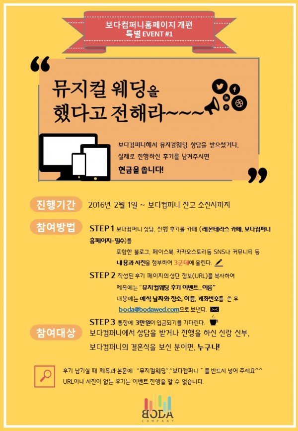 보다컴퍼니는 많은 신랑 신부님들의 후기를 기다리고 있습니다. 보다컴퍼니의 통장이 비는 날까지 후기 이벤트는 계속 됩니다. ^^