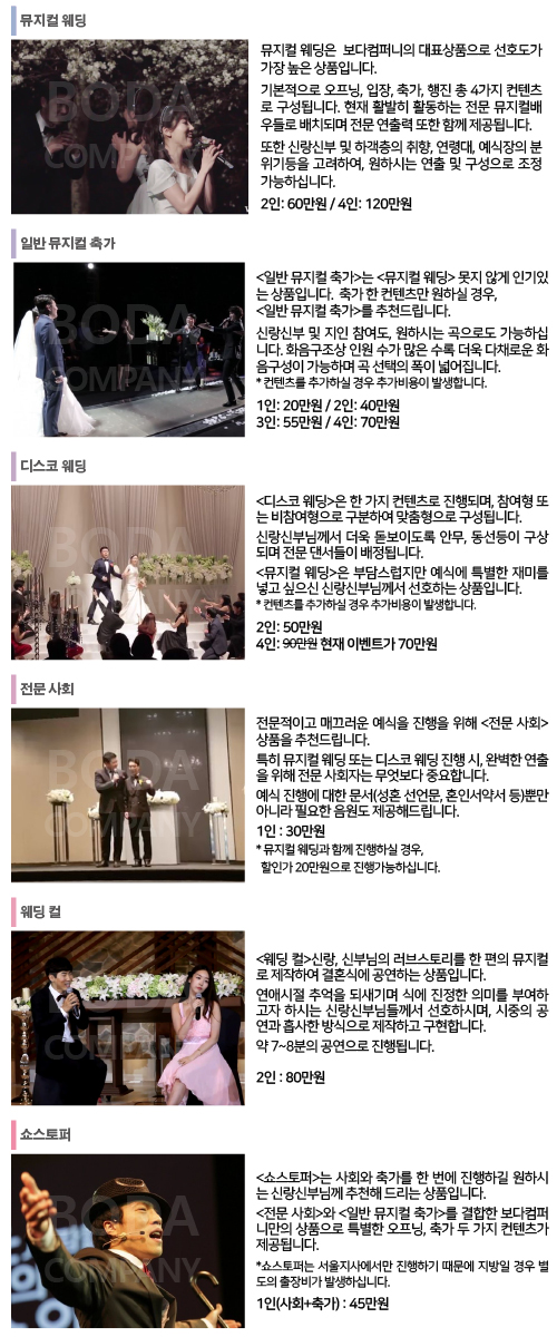 또한 뮤지컬 웨딩 또는 쇼스토퍼등 다양한 상품과의